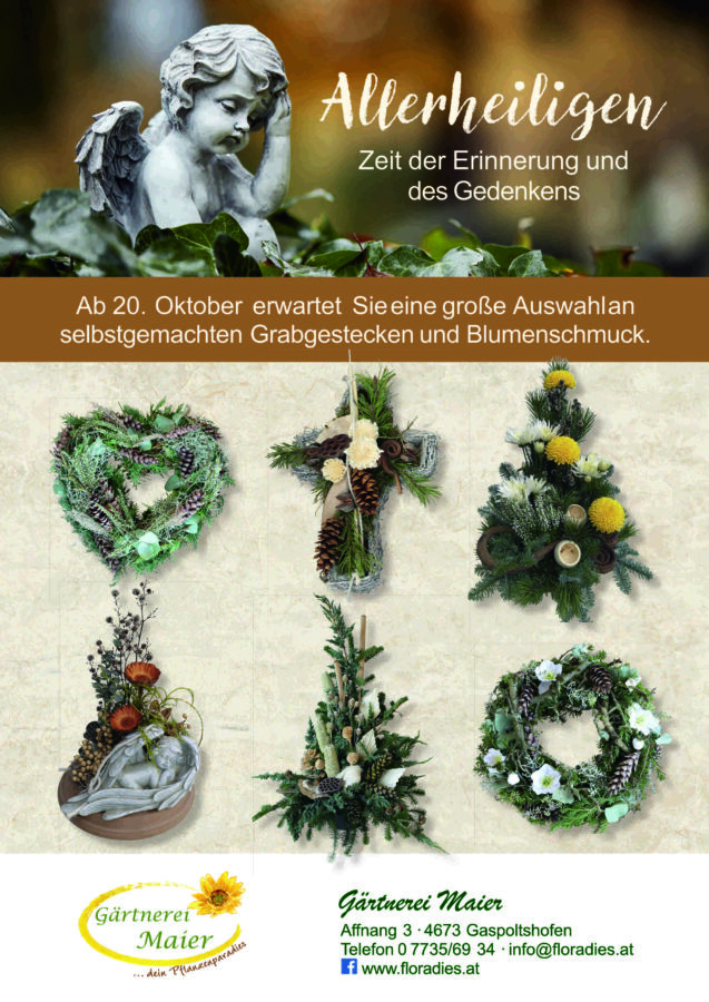Eine große Auswahl an Allerheiligengestecken, Grabsträuße und viele weitere Grabarrangements, die von unseren Floristinnen mit viel Liebe und Kreativität handgemacht wurden, warten im Floradies und in der Gärtnerei Maier auf Sie.